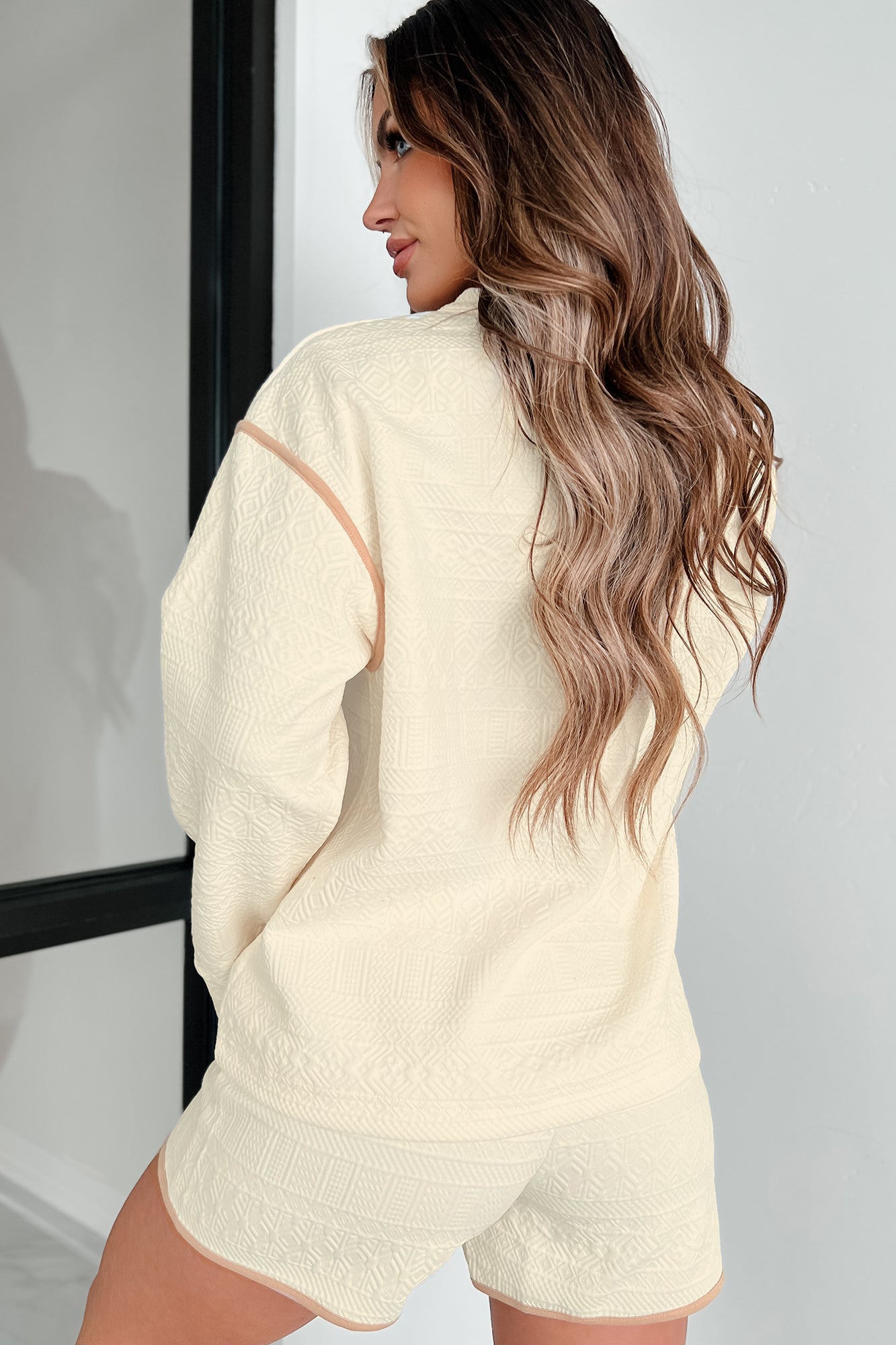 - Top: Geometric Texture, Tan Contrast Trim, Functional Button Detail, Long Sleeve