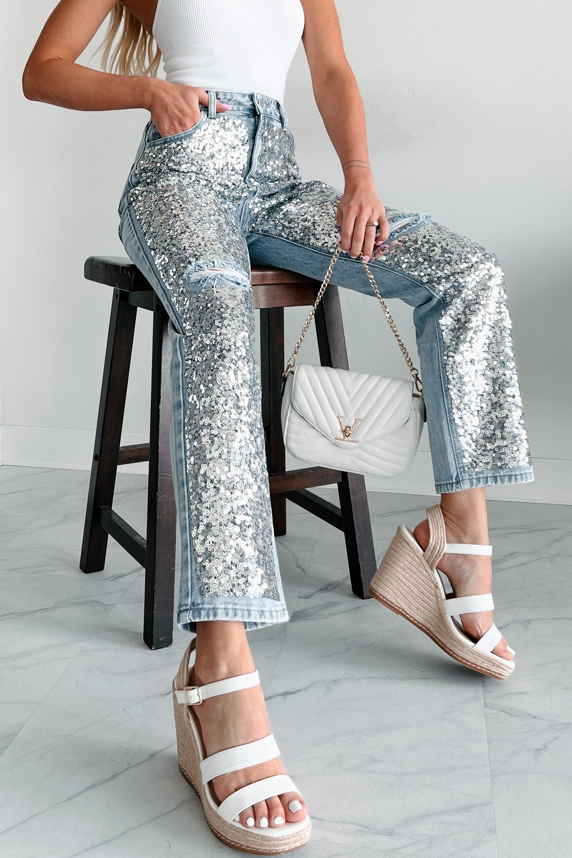 Dazzled High Rise Sequin Straight Leg Jeans (Silver/Light Wash)