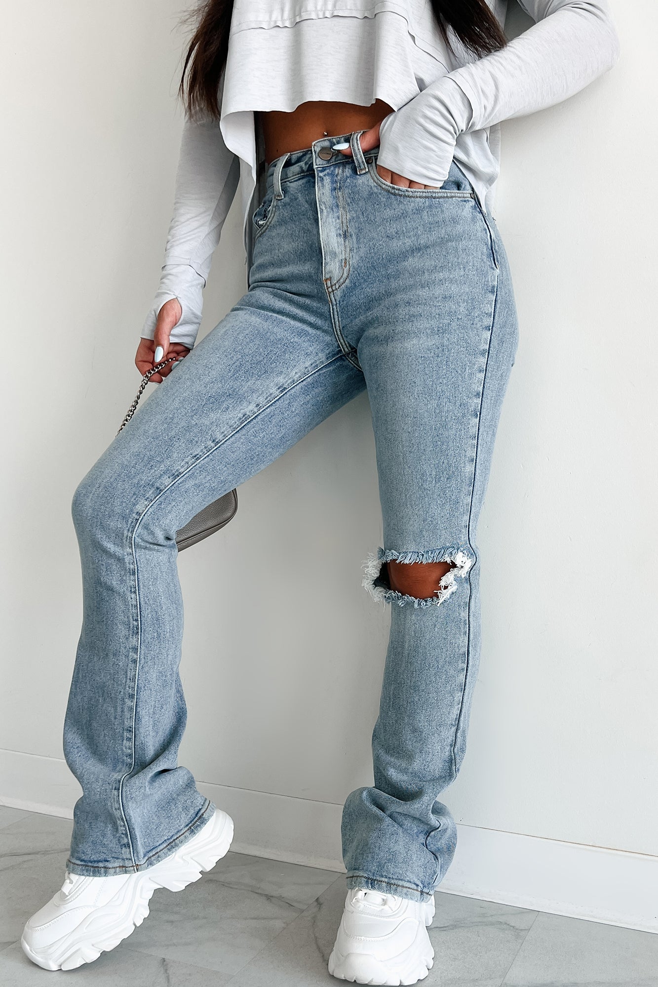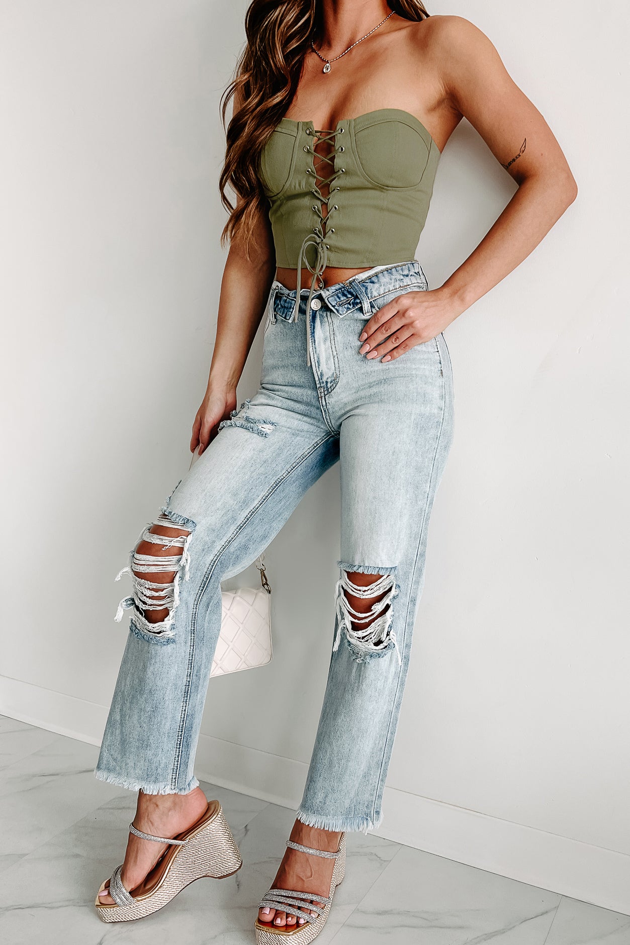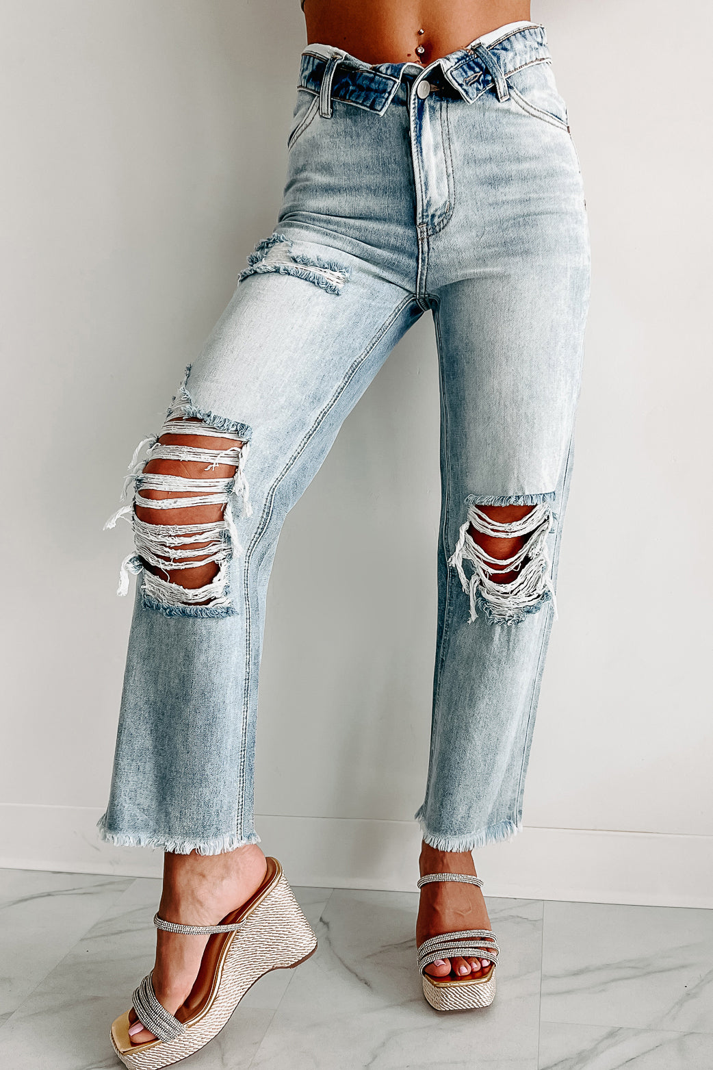 On The Lowdown Flip Waist Distressed Straight Leg Jeans (Medium-Light)