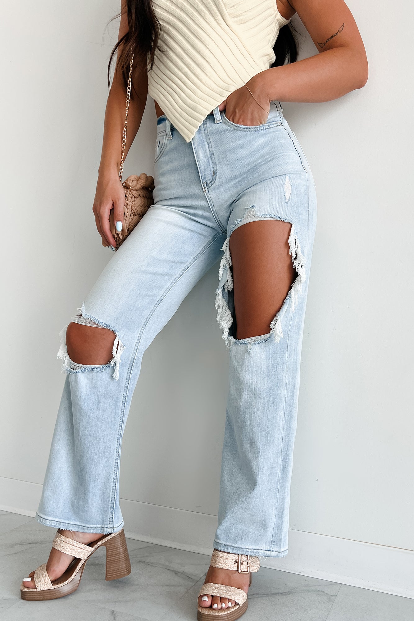 Ronan High Rise Distressed Dogma Flare Jeans (Light Wash)