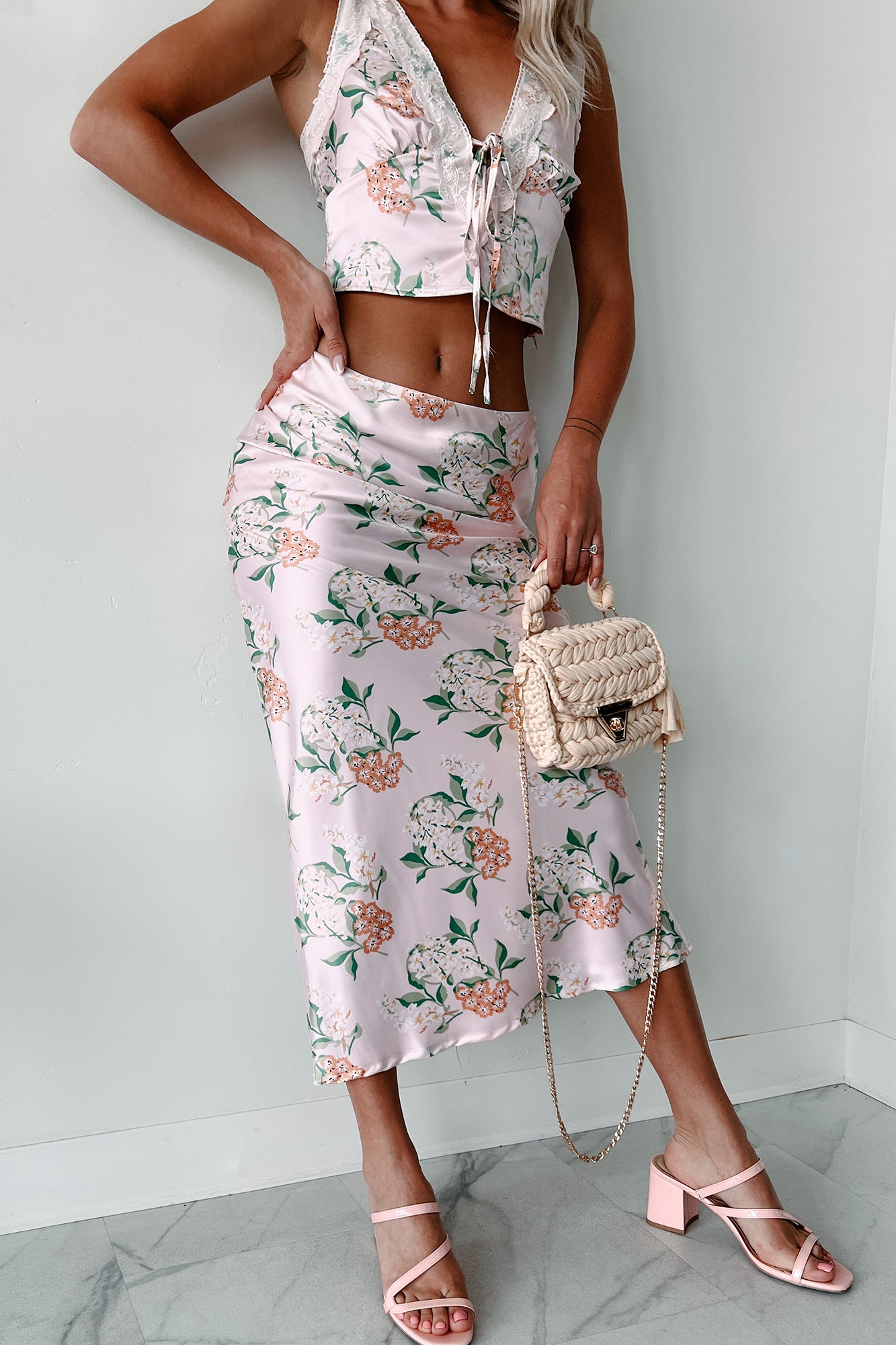 Springtime Sentiments Floral Satin Skirt (Blush)