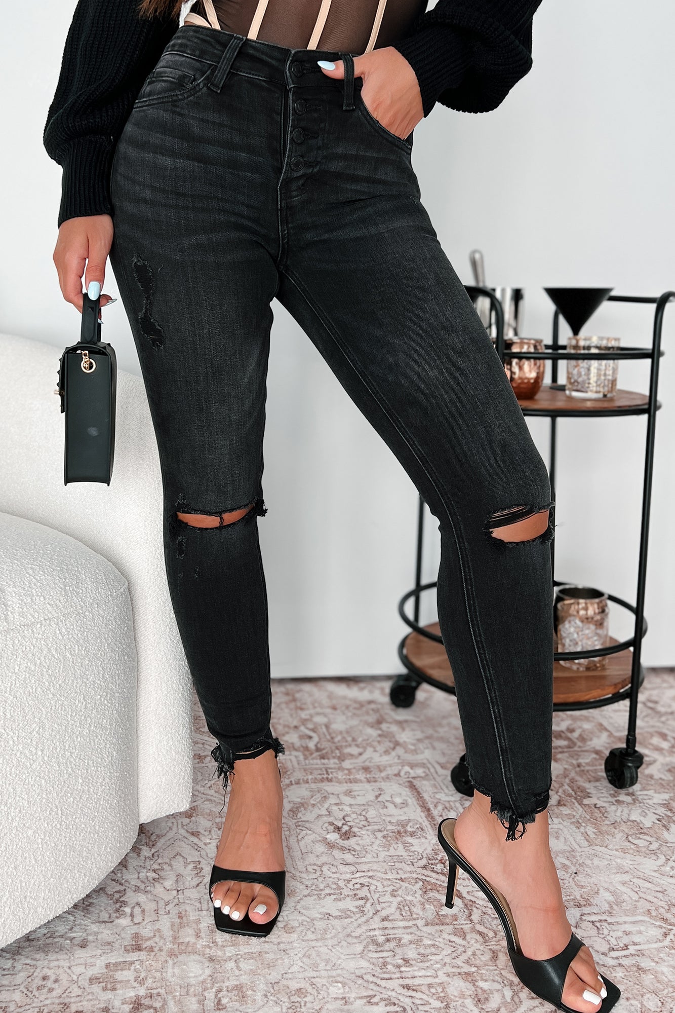 Night Reflections High Rise Button-Fly Vervet Skinny Jeans (Black)