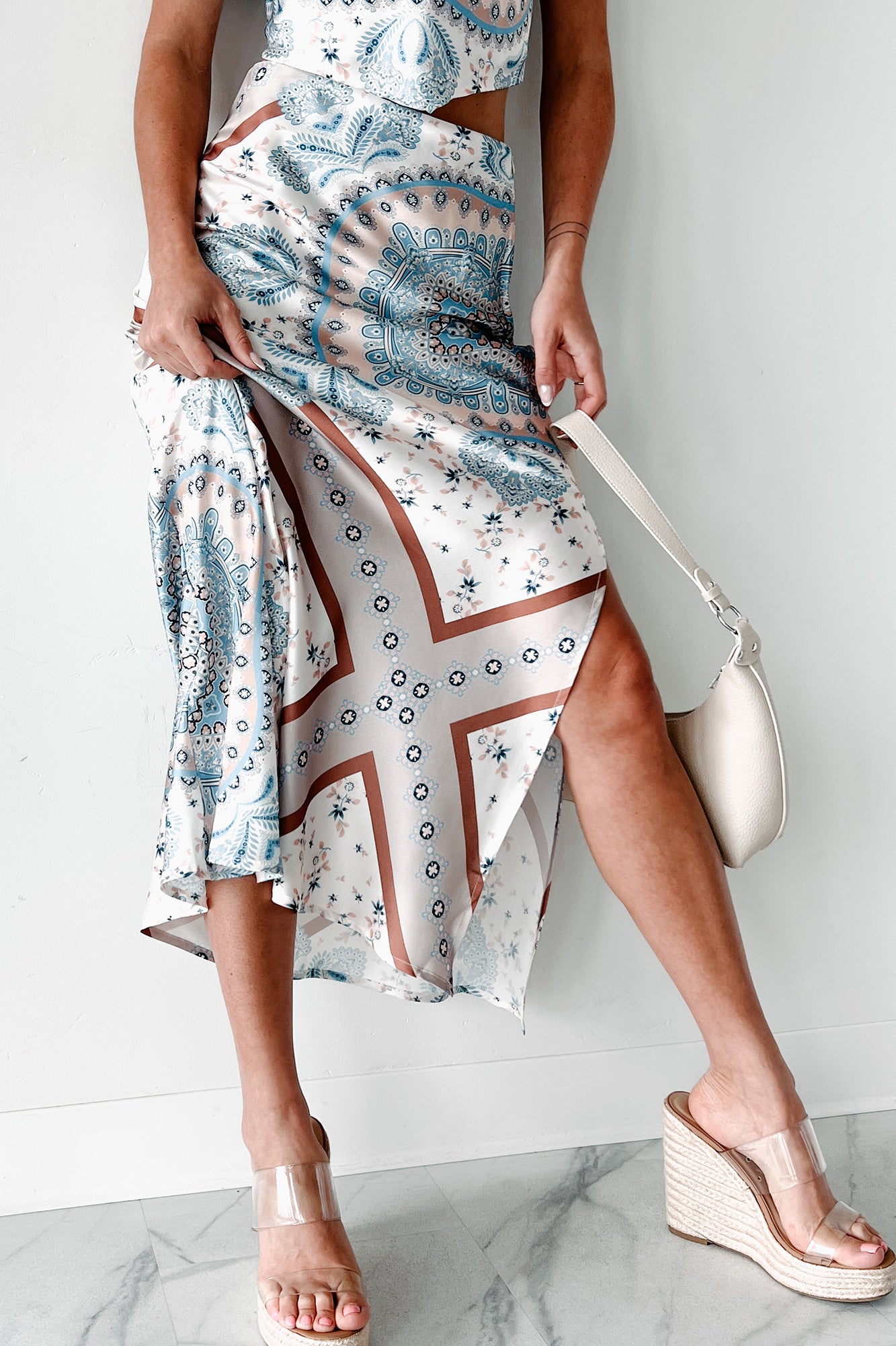 Instantly Adored Printed Satin Maxi Skirt (Sand Multi)
